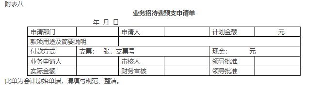 (一)业务招待费支出前,应填写《业务招待费预支申请单》,由部门主任签字,送秘书长或其授权的副秘书长审批后方可办理借款手续。