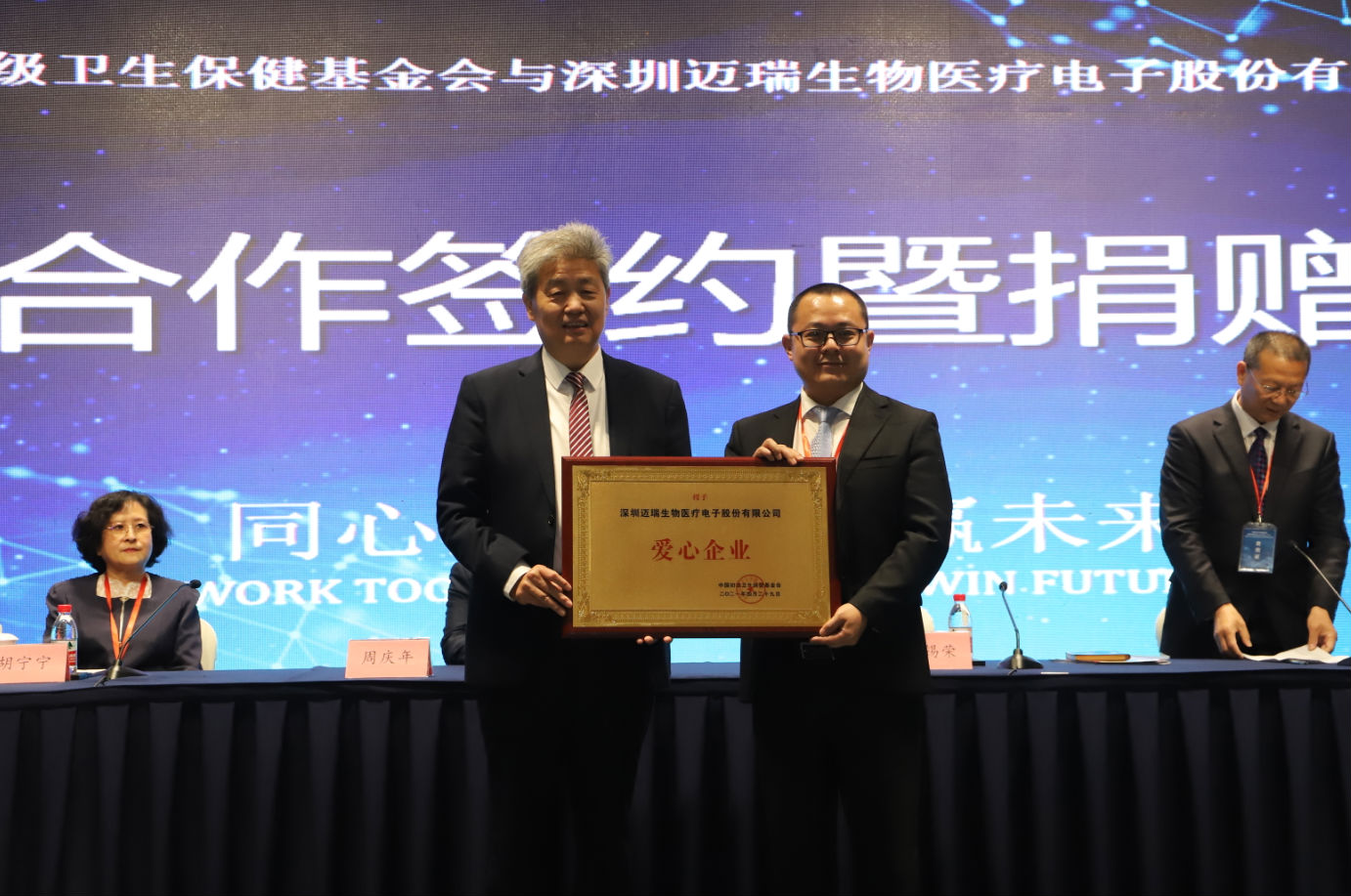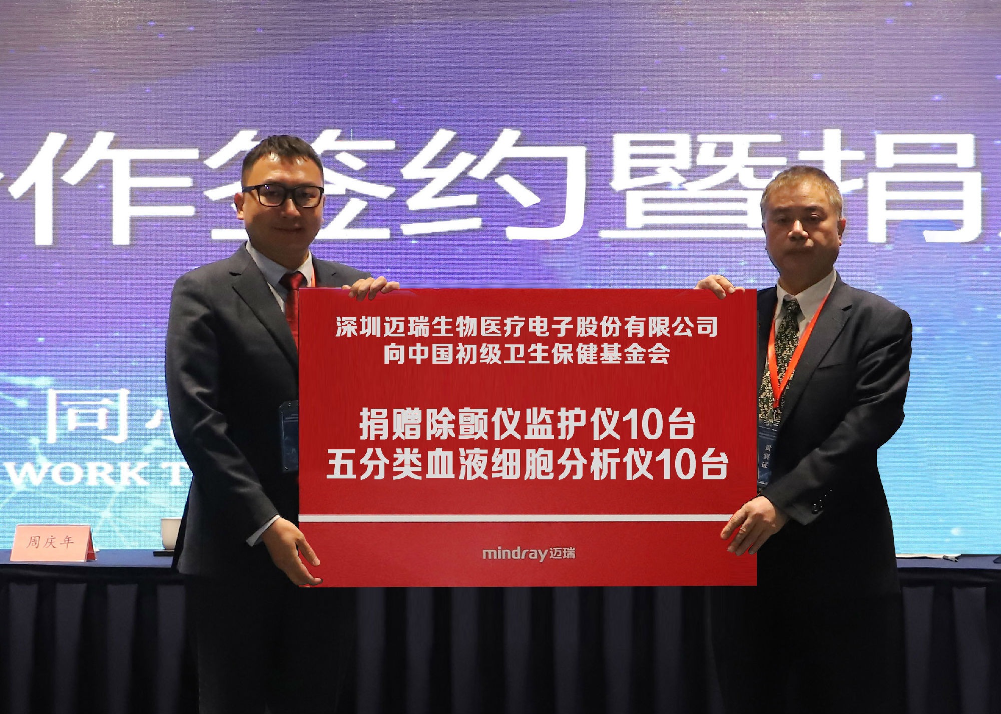 随后,中国初级卫生保健基金会与深圳迈瑞生物医疗电子股份有限公司举行了战略合作签约仪式。同时,杨程文经理代表迈瑞公司向中国初级卫生保健基金会捐赠心脏除颤仪和五分类血液细胞分析仪各10台。曹锡荣理事长向深圳迈瑞生物医疗电子股份有限公司颁发爱心企业标牌。