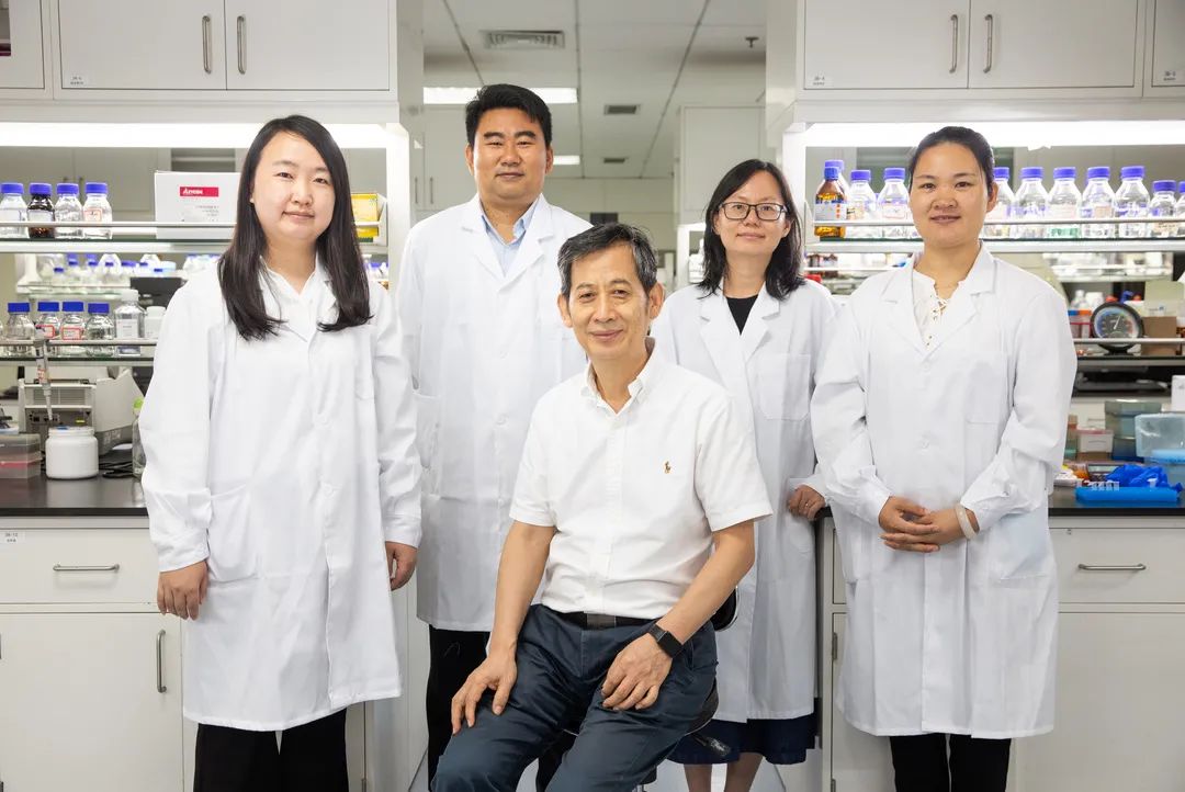 科研团队乔婧科研助理、蔡韬副研究员、马延和研究员、朱蕾蕾研究员、孙红兵科研助理(从左至右)在中国科学院天津工业生物技术研究所实验室合影(9月16日摄)。新华社记者 金立旺 摄