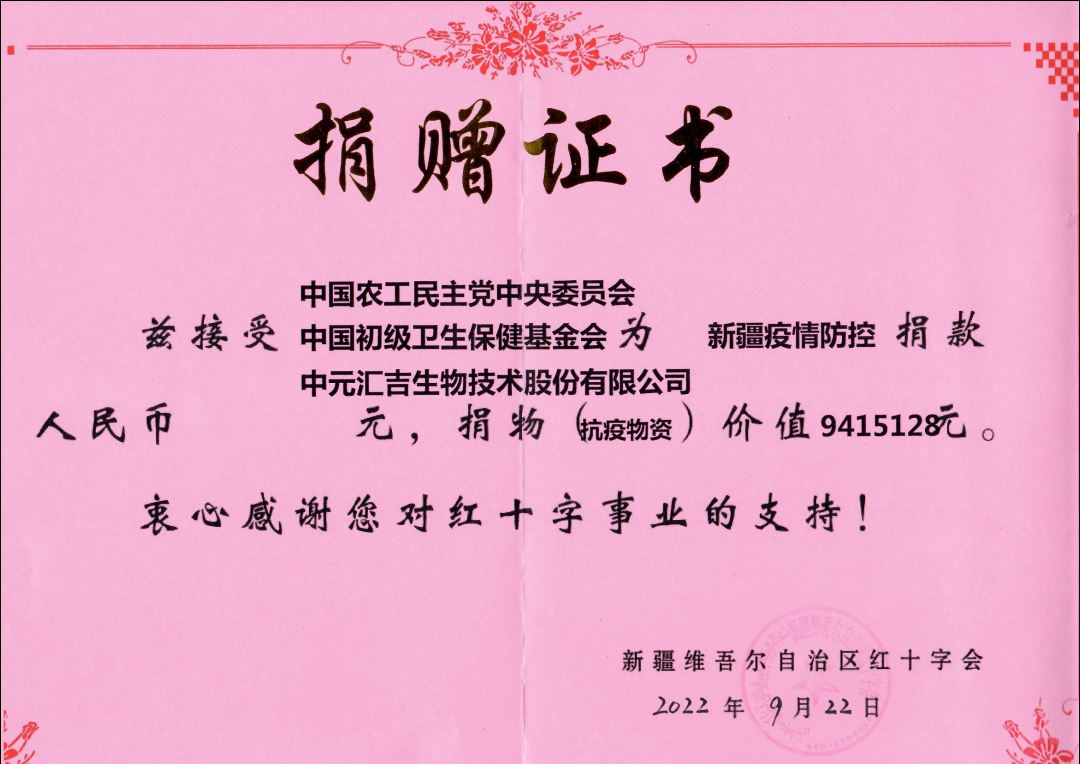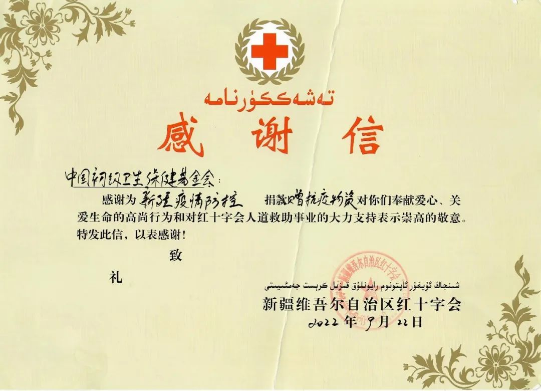 近日,中国初级卫生保健基金会(简称“初基会”)收到新疆维吾尔自治区红十字会寄来的感谢信和捐赠证书。感谢信情真意切,感谢初基会为新疆疫情防控捐赠物资,对初基会奉献爱心、关爱生命的高尚行为和对红十字会人道主义救助事业的大力支持表示崇高的敬意。