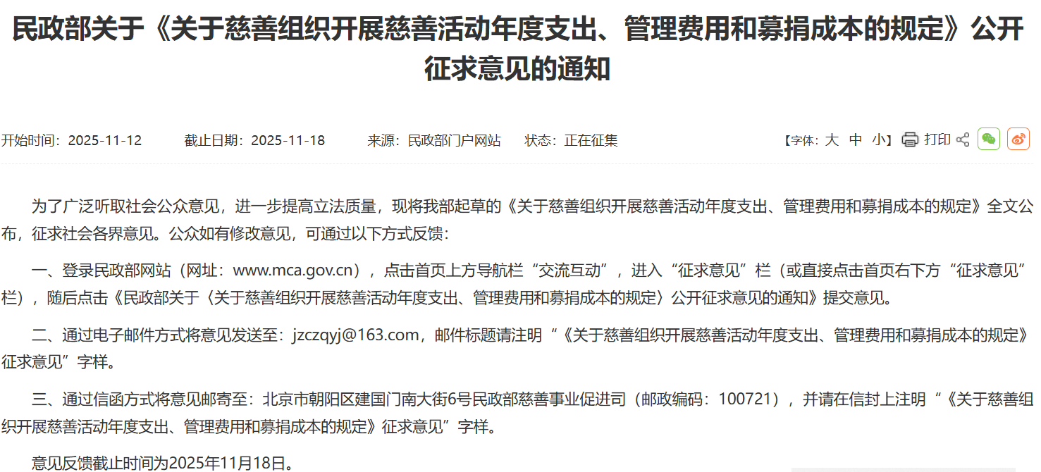 11月12日,民政部官网发布《关于慈善组织开展慈善活动年度支出、管理费用和募捐成本的规定》(以下简称《规定》),并公开征求社会各界意见。意见反馈截止时间为2025年11月18日。